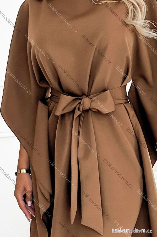 Mäkká, príjemná látka sa krásne vlní v pohybe, zatiaľ čo asymetrické krídelká/pončo jemne maskujú oblasť ramien a pásu. Jednoduchý okrúhly výstrih a dĺžka po kolená vytvárajú moderný, nadčasový vzhľad. Vyrobené v Poľsku - kvalita značky Numoco.