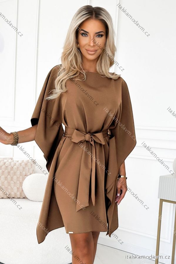 Mäkká, príjemná látka sa krásne vlní v pohybe, zatiaľ čo asymetrické krídelká/pončo jemne maskujú oblasť ramien a pásu. Jednoduchý okrúhly výstrih a dĺžka po kolená vytvárajú moderný, nadčasový vzhľad. Vyrobené v Poľsku - kvalita značky Numoco.