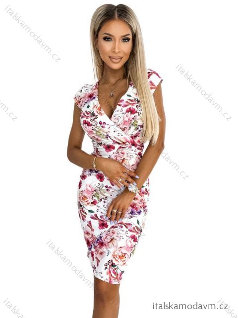 Boyka - vypasované šaty s psaníčkovým výstřihem a krátkým rukávem. Provedení: růžové a fialové malované květy. Značka Numoco . Polská výroba.