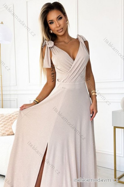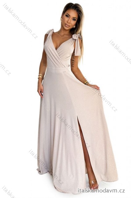 405-6 ELENA Dlhé šaty s výstrihom a zaväzovaním na ramenách - béžové s trblietkami