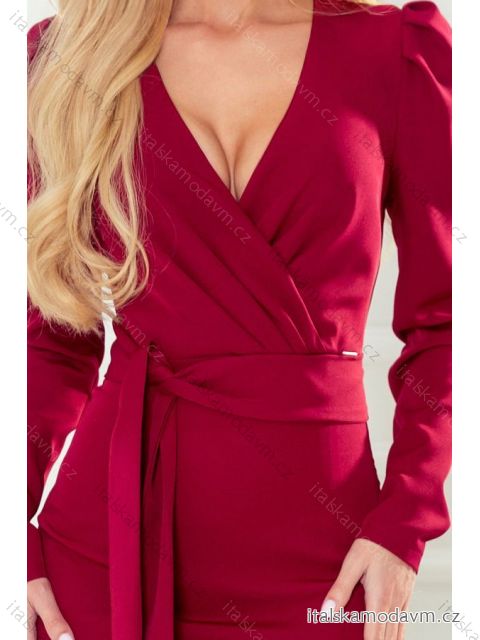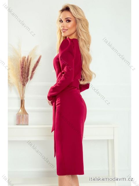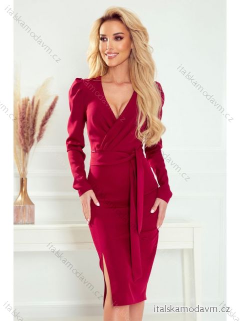 EDITTA - elegantné šaty s výstrihom, dlhými rukávmi, opaskom a naberačkami na ramenách. Vyrobené z na dotyk príjemného materiálu v módnej bordovej farbe. Poľský výrobok. Značka Numoco.