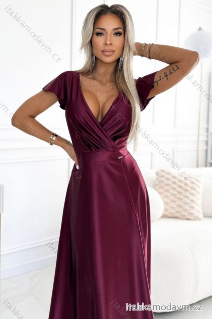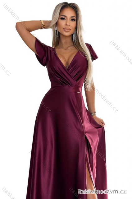 ZBOŽÍ (21605) > 411-10 CRYSTAL saténové dlhé šaty s výstrihom - Bordová farba