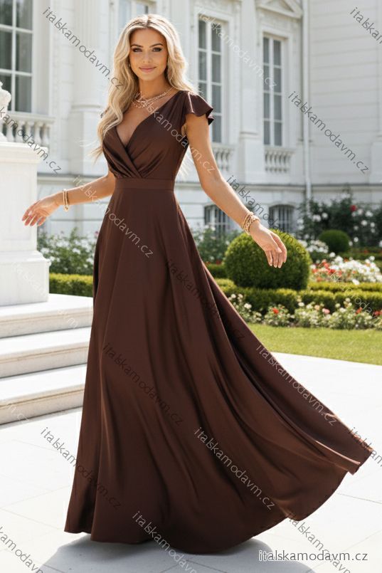 411-15 CRYSTAL saténové dlouhé šaty s výstřihem - čokoládové