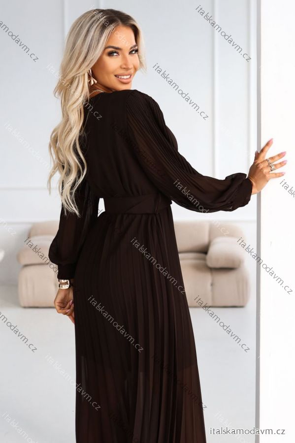 Čokoládové plisované midi šaty s páskem a výstřihem - Numoco Basic