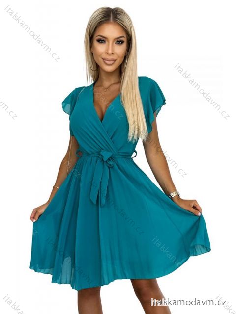 ZBOŽÍ (21839) > 424-1 Šifónové skladané šaty s výstrihom a volánmi - morská farba