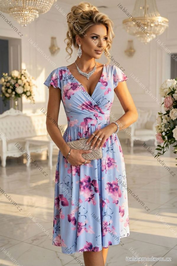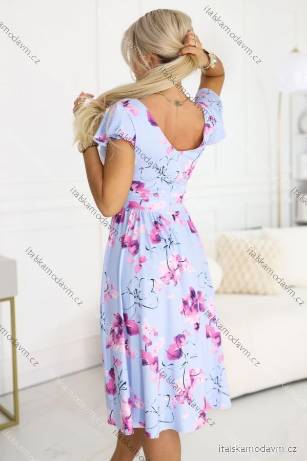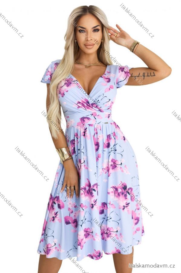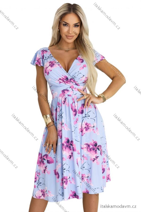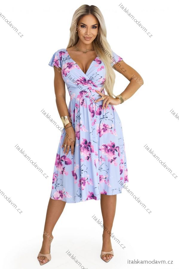425-14 MATILDE Zvonové midi šaty s výstrihom do V a krátkym rukávom - modré s ružovými kvetmi