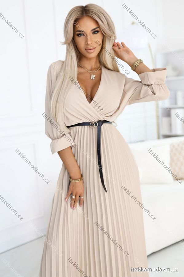 ZBOŽÍ (22817) > 462-5 SERENA Plisované maxi šaty s výstrihom, opaskom a 3/4 rukávmi - TMAVO BÉŽOVÁ