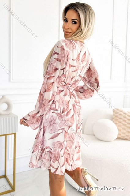 ZBOŽÍ (21904) > Oblečení dámské (17864) > Šaty (9441) > Šaty elegantní (2604) > Šaty elegantní dlouhý rukáv (891) > 514-1 Šifonové šaty s výstřihem, volány a páskem - béžové květy