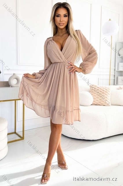 ZBOŽÍ (23040) > Oblečení dámské (18396) > Šaty (9741) > Šaty krátké - minišaty (569) > 538-1 MILA Šifonové midi šaty s dlouhým rukávem a výstřihem - béžové