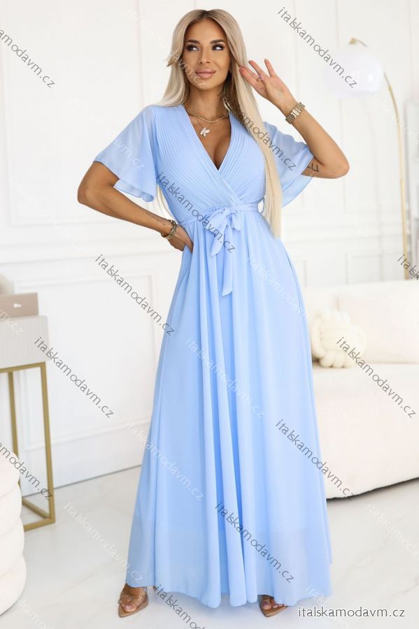 ZBOŽÍ (22594) > 545-2 Dlhé šaty s plisovaným výstrihom a zaväzovaním - svetlomodré