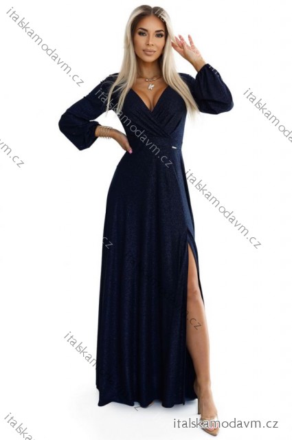 ZBOŽÍ (22043) > 572-1 NELA lesklé dlhé šaty s výstrihom a dlhými rukávmi - námornícka modrá