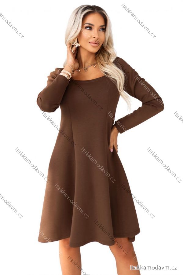 574-2 IVANA pohodlné trapézové šaty s výstrihom a dlhými rukávmi - čokoládové