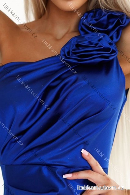 ZBOŽÍ (22662) > 580-3 AURORA dlhé saténové šaty na jedno rameno s ružou - modrá farba