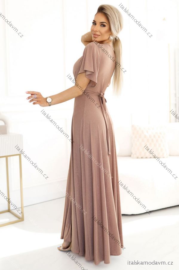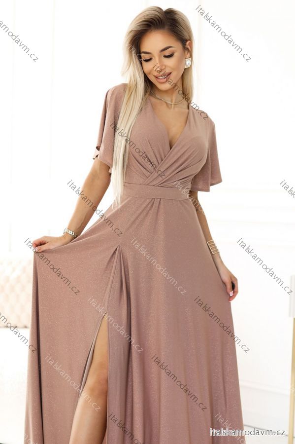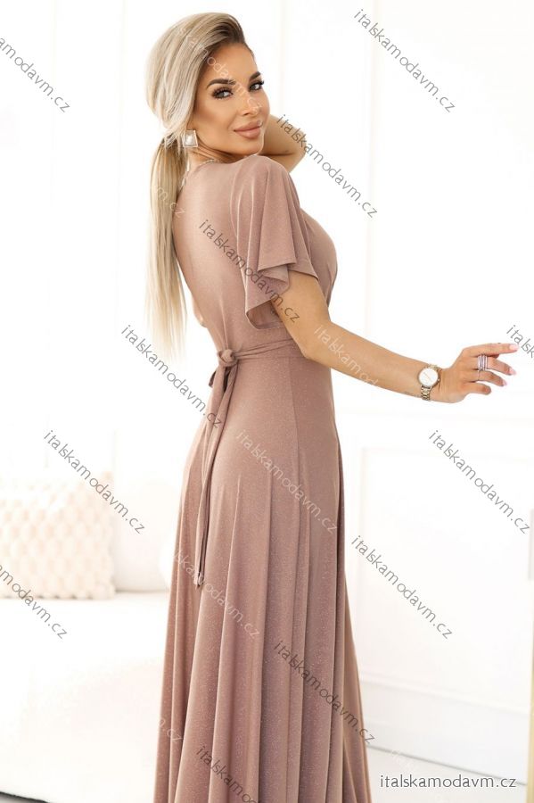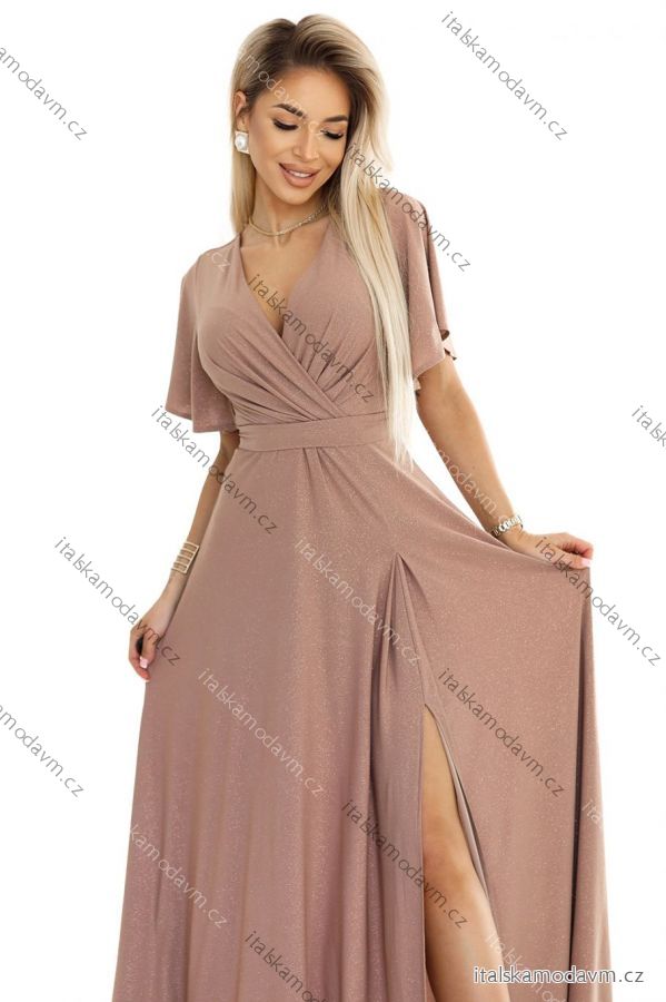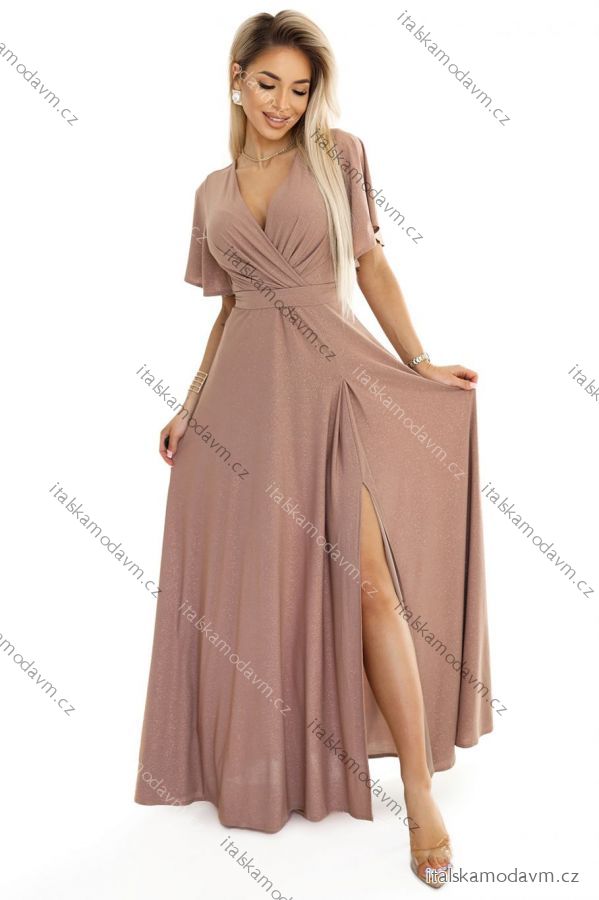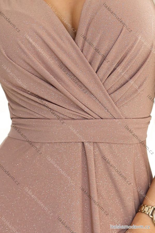 ZBOŽÍ (21607) > 581-4 JENNIFER lesklé dlhé šaty s rukávmi a výstrihom - moka pena s trblietkami