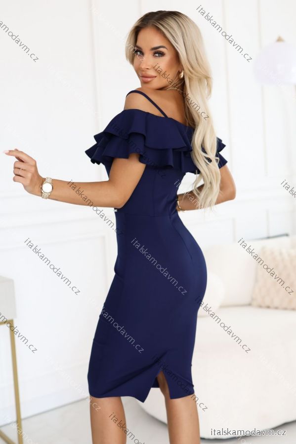 tmavomodré koktejlové šaty, šaty s volánikom, ceruzkové midi šaty, elegantné svadobné šaty, poľský produkt Numoco