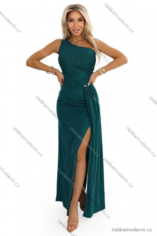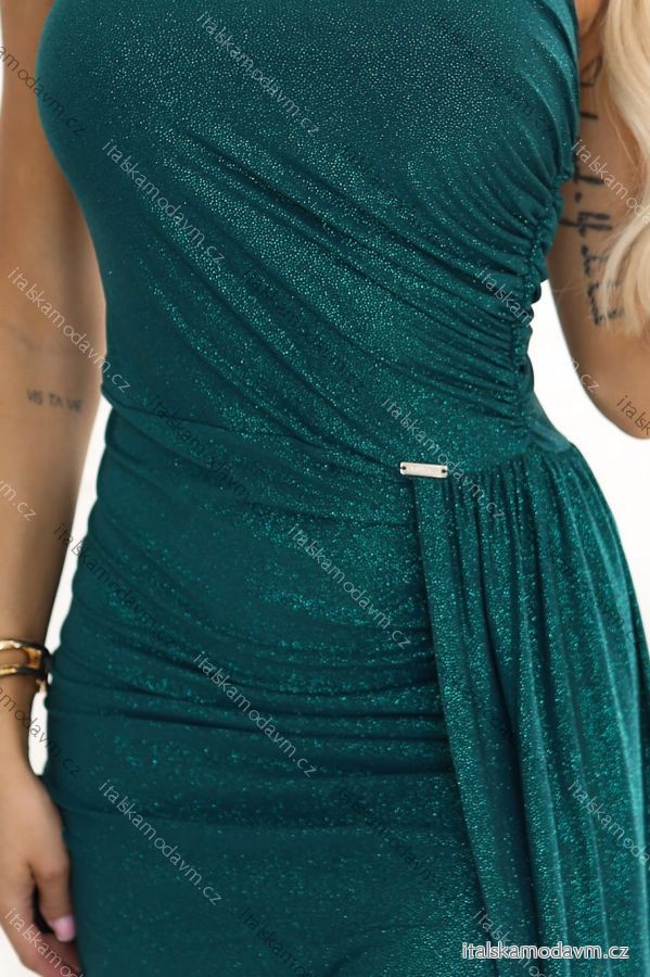 ZBOŽÍ (22230) > 600-2 SELENA trblietavé dlhé šaty na jedno rameno s rozparkom - zelené s trblietkami