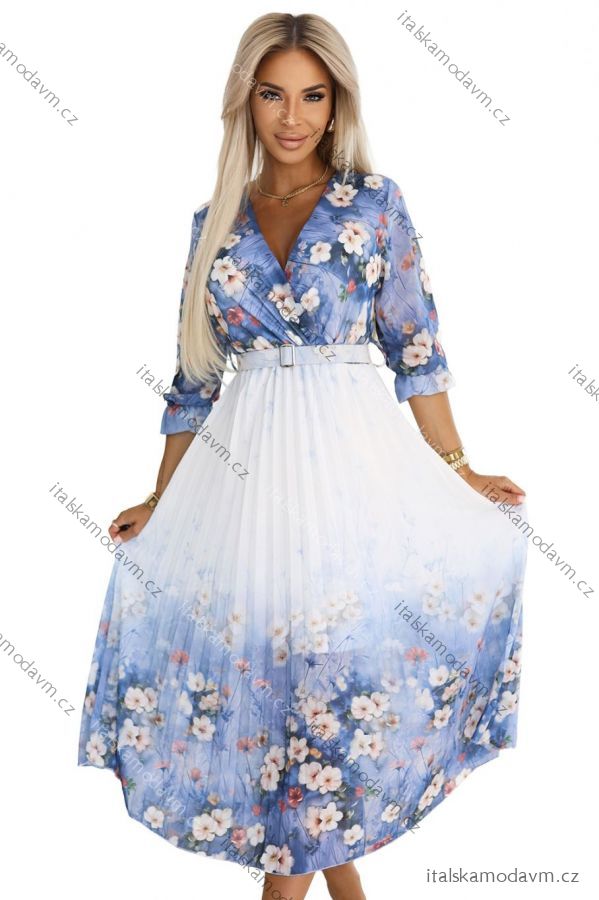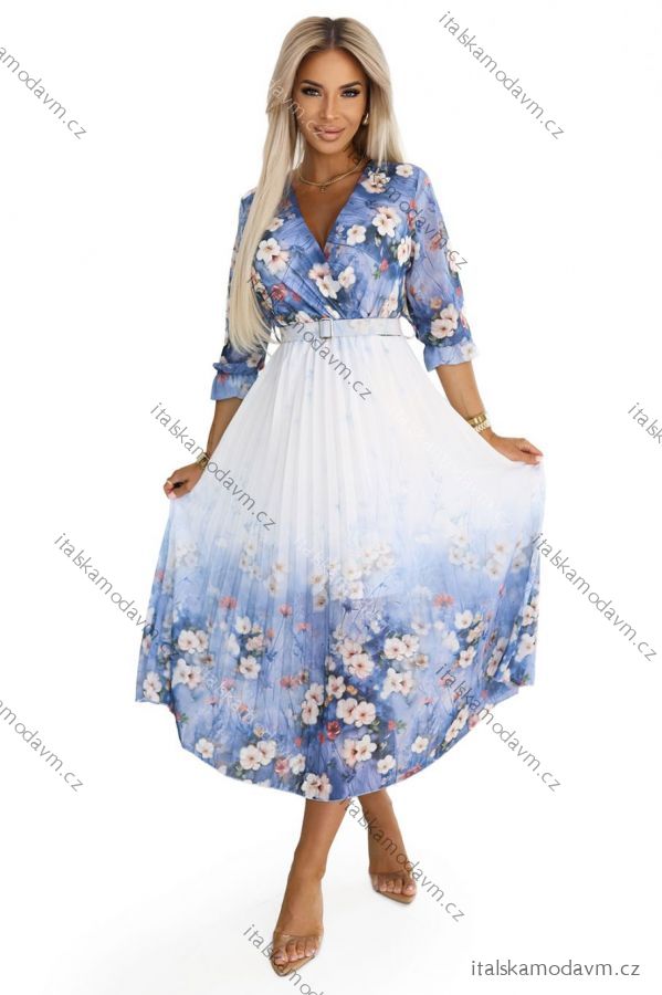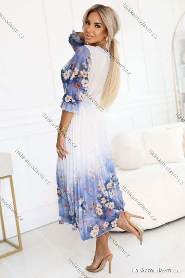 605-1 Ženské vzdušné midi šaty s výstrihom do vrecka a záhybmi – svetlomodré s poľnými kvetmi