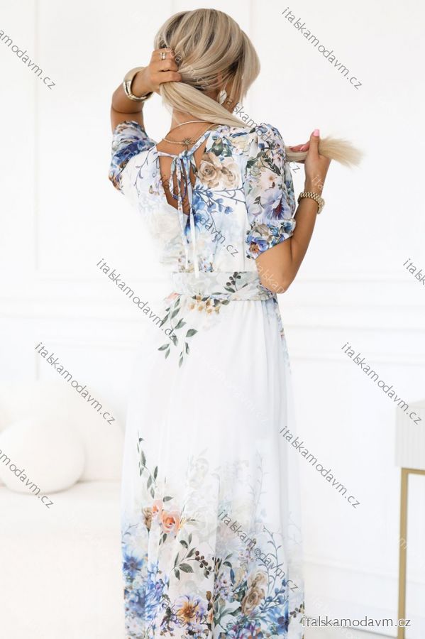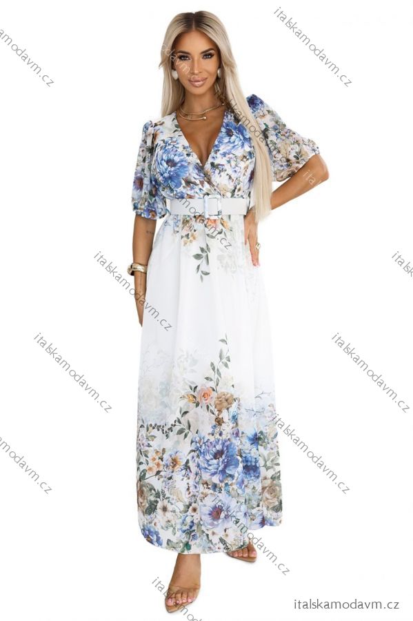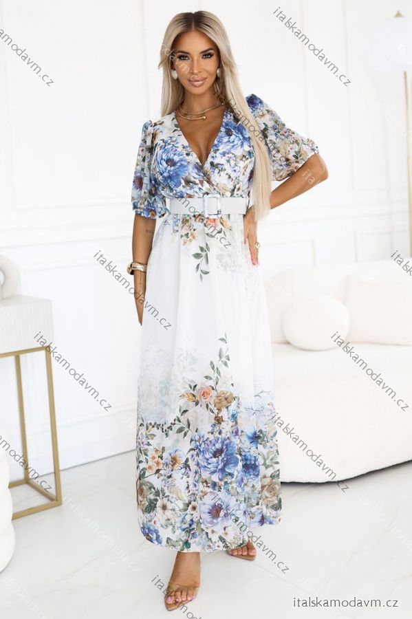 Modré maxi šaty s květinovým ombré, výstřihem a páskem. Lehké, romantické a ženské ideální na léto. Značka Numoco Basic. Evropská výroba.