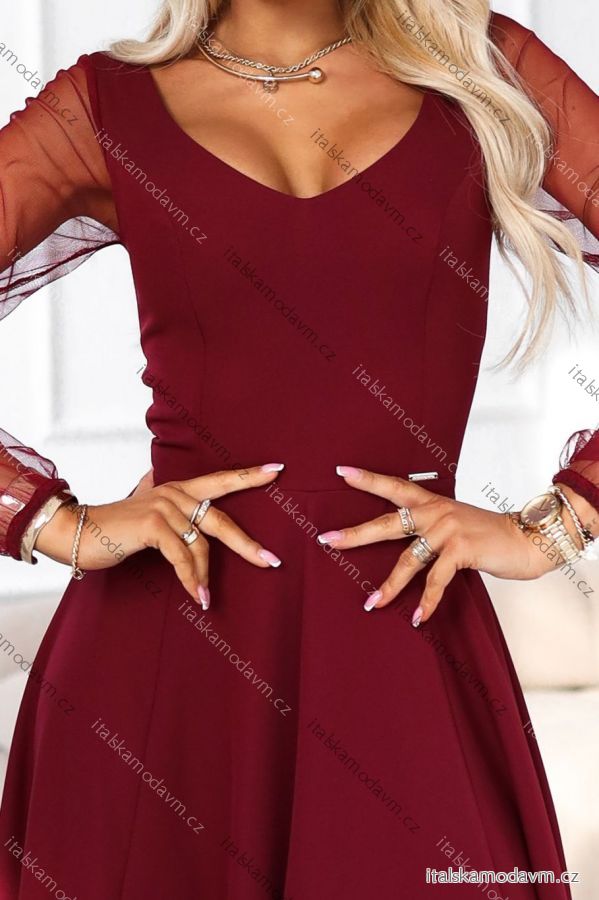 Elegantné bordové maxi šaty s tylovými rukávmi - zmyselná klasika od Numoco