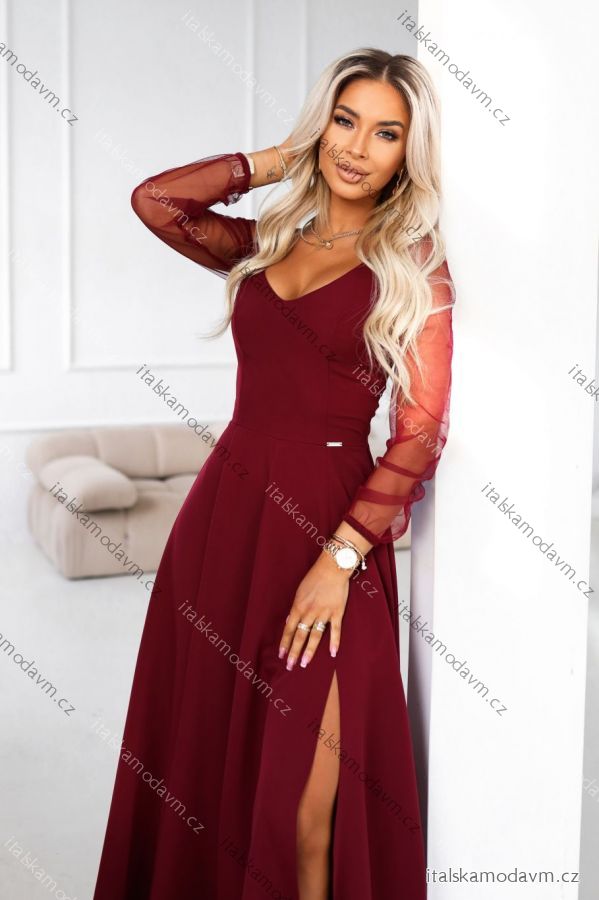 Elegantné bordové maxi šaty s tylovými rukávmi - zmyselná klasika od Numoco