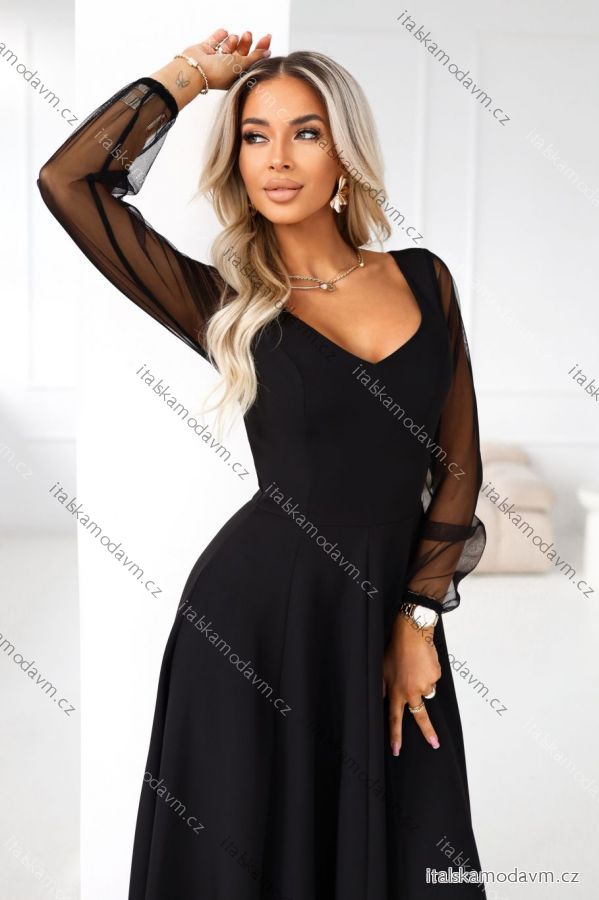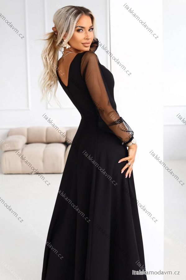 Elegantné čierne maxi šaty s tylovými rukávmi - zmyselná klasika od Numoco