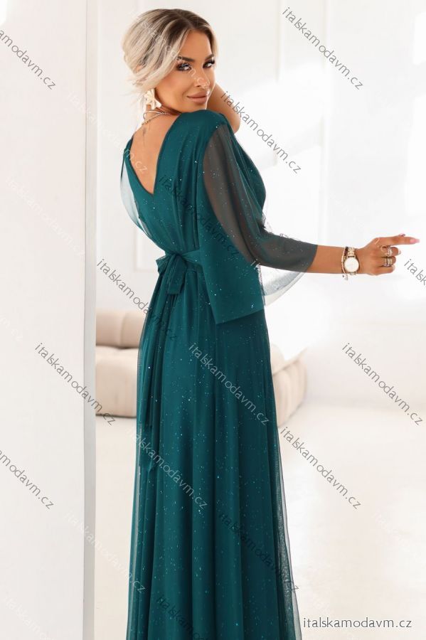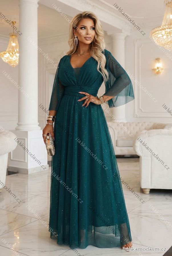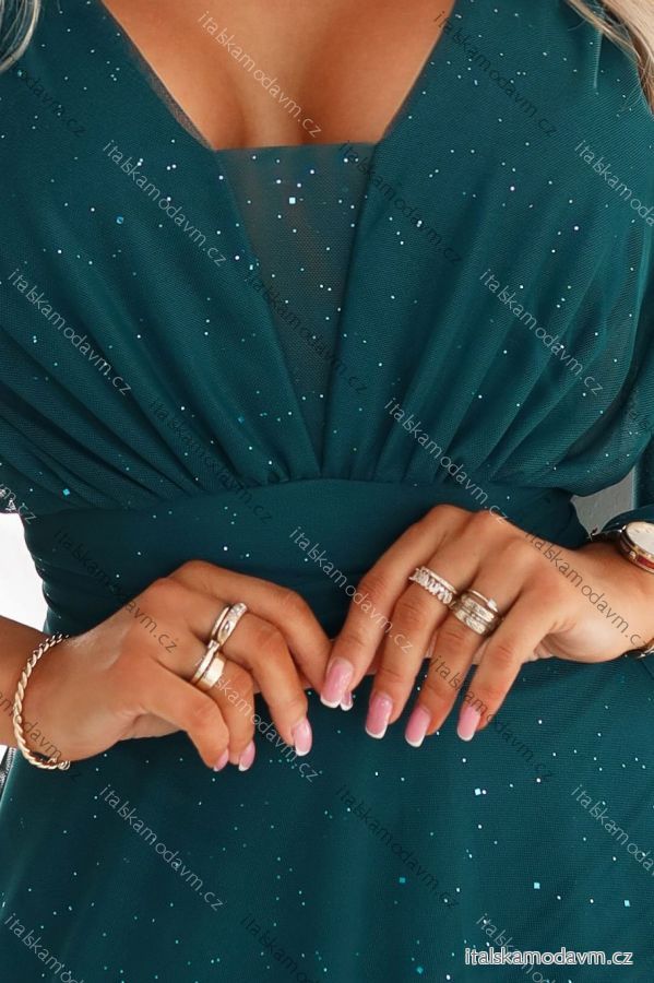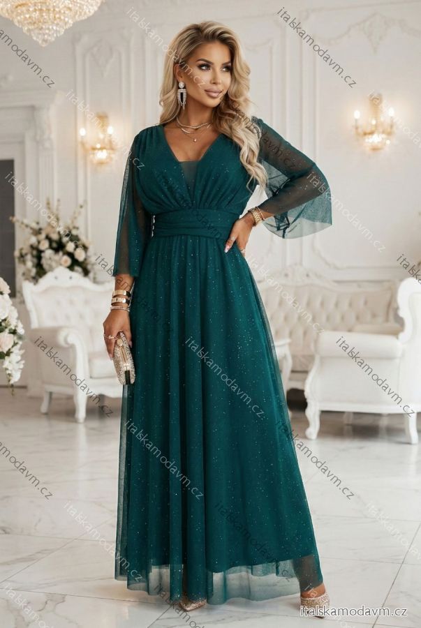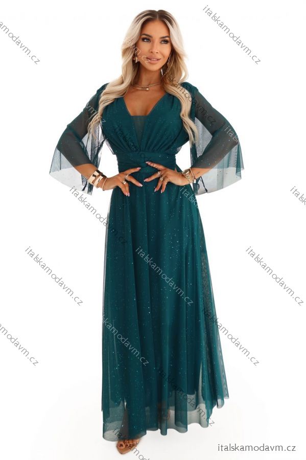654-1 Dlhé, trblietavé šaty plus size s výstrihom a priehľadnými rukávmi - fľaškovozelené
