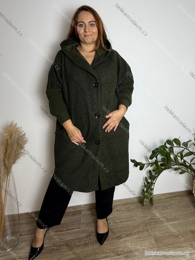 Kabát flaušový teplý dlouhý rukáv dámský nadrozměr (54/56/58 ONE SIZE) ITALSKÁ MÓDA IMD25274/DUR 54/56/58 zelená khaki