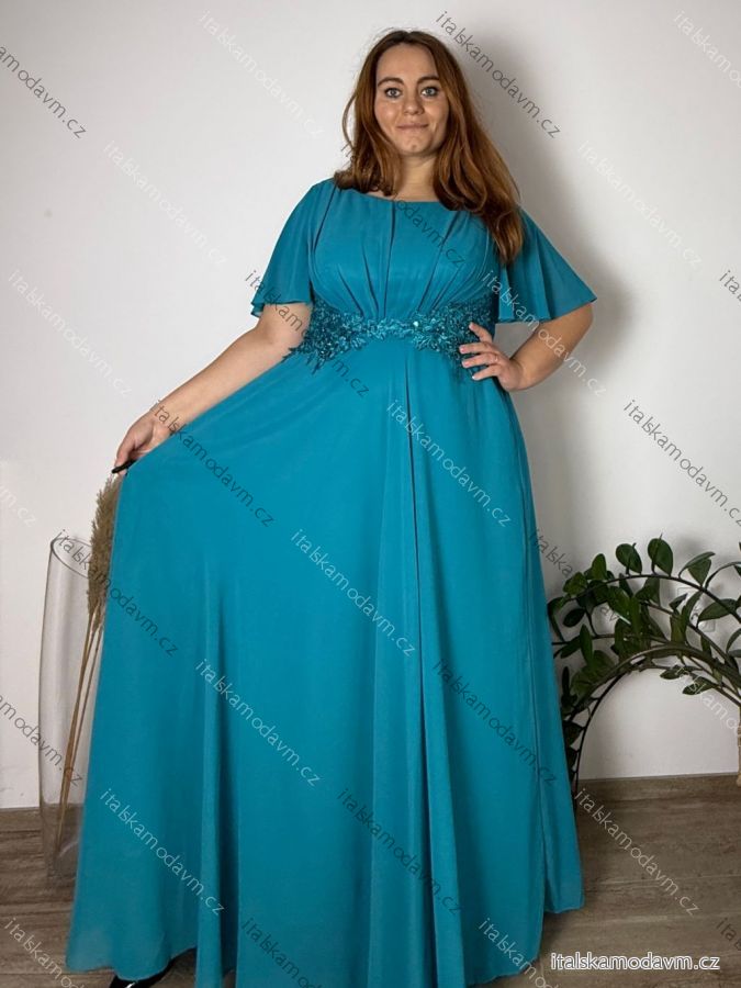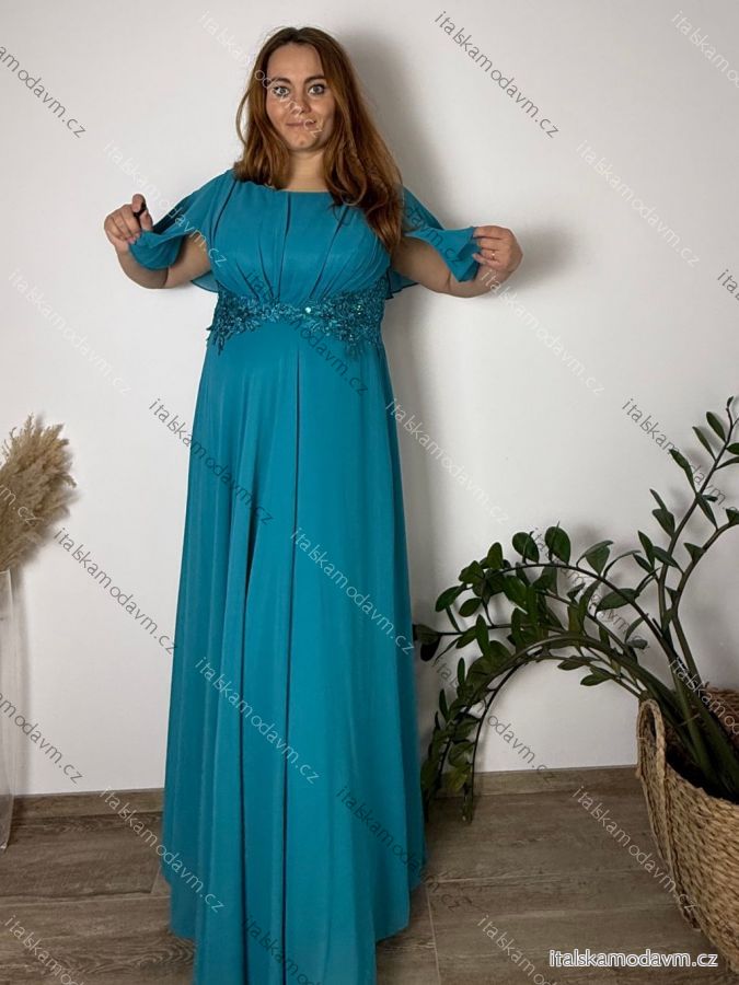 Šaty dlhé spoločenské so žabičkovaním krátky rukáv dámske nadrozmer RIKI (48/50/52 ONE SIZE) TALIANSKA MÓDA IMC25522/DUR svetle petrolejová