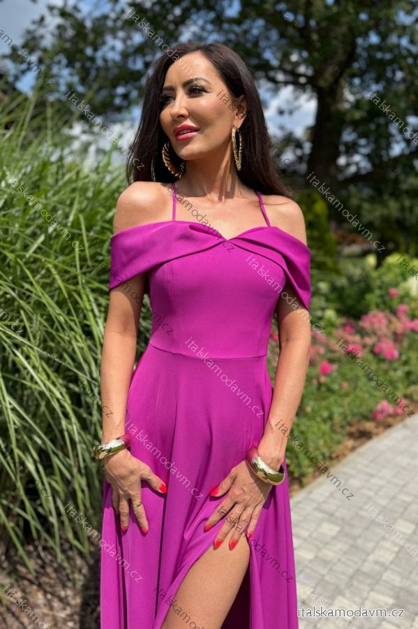Šaty dlouhé carmen přes ramena společenské třpytivé dámské (34-42) POLSKÁ MÓDA PMLEL25SILLA2 fialová 40