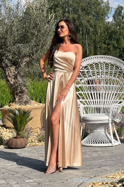 Šaty dlouhé společenské saténové na ramínka dámské (34-42) POLSKÁ MÓDA PMLEL24NATHALIEA béžová 38
