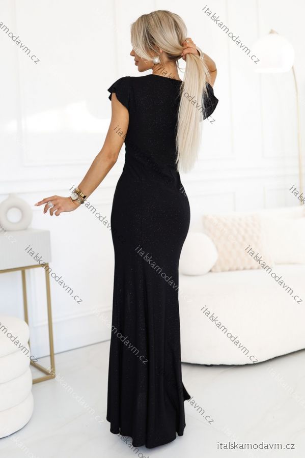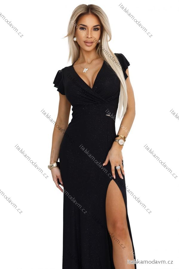 IRINA úžasné dlouhé černé šaty s brokátem, zavinovacím výstřihem a rozparkem na nohavicích | Numoco | Polský produkt