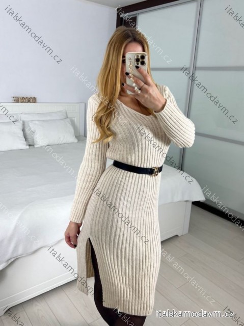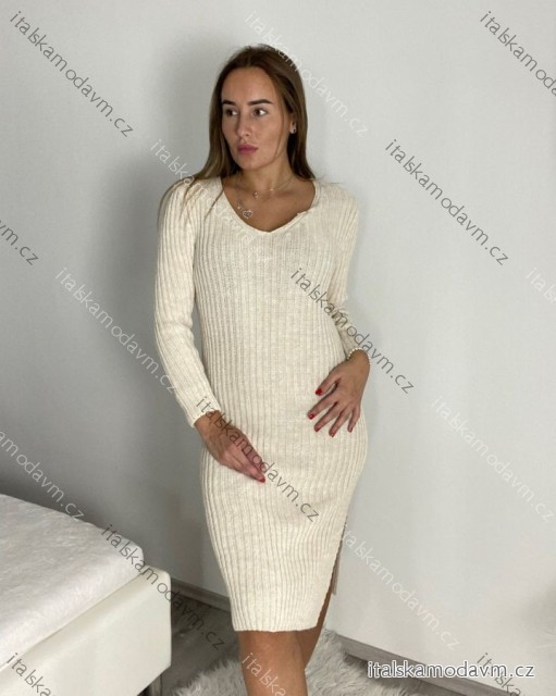 Šaty pletené dlhý rukáv dámske (S/M/L ONE SIZE) TALIANSKA MÓDA IMWBL24150/DU - béžová smetanová - S/M/L