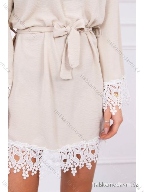 Predstavujeme vám módne a elegantné šaty. Spodná časť šiat a rukávov sú zakončené čipkou. Model má v páse kravatu. Tento model bude ideálny pre každú dámu. Šaty sú vyrobené z vysoko kvalitného materiálu. Veľkosť je univerzálna a bude vhodná pre ženy, ktoré majú veľkosť M, L alebo XL.