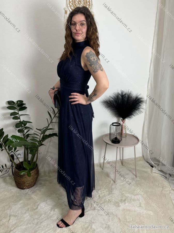Dlouhé společenské šaty bez rukávu, se zapínáním za krkem na knoflíček. Šaty mají prsní vycpávky