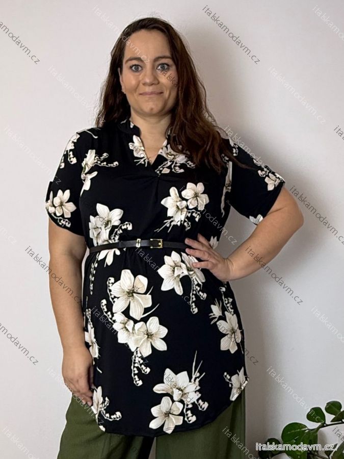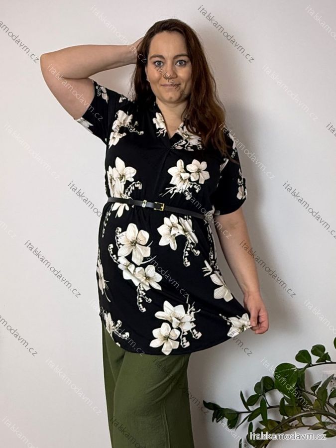 Šaty/tunika košeľová s opaskom krátky rukáv dámske FLOO (52/54/56 ONE SIZE) TALIANSKA MóDA IM3261112-2/DU čierna