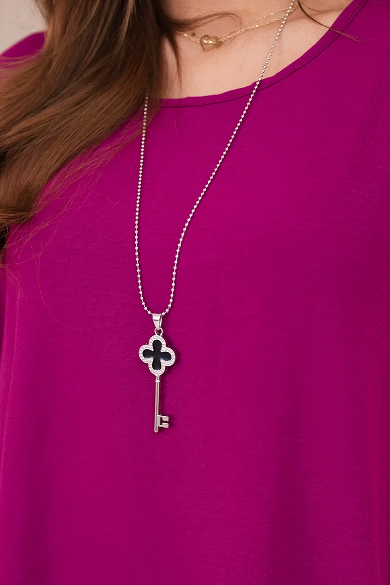 Taliansky dvojdielny set pozostávajúci z rozšírenej blúzky a nohavíc je elegantný set, ktorý dodá šarm a štýl akémukoľvek štýlu. Rozšírená blúzka dodáva jemnú ženskosť, zvýrazňuje postavu a zároveň zaisťuje voľnosť pohybu. Vďaka klasickému strihu nohavíc dokonale ladia s elegantnou blúzkou a vytvárajú tak ucelený a štýlový celok. Prívesok v tvare kľúča je navyše očarujúcim detailom, ktorý dodáva tejto súprave originalitu a charakter a vytvára harmonickú kompozíciu. Ide o elegantný doplnok, ktorý podčiarkuje jedinečnosť a zmysel pre detail v celom stylingu. Tento taliansky set je ideálny na mnohé príležitosti, od obchodných stretnutí až po romantické rande. Toto je rafinovaná možnosť pre ľudí, ktorí si cenia eleganciu a pohodlie v jednom. Veľkosť je univerzálna a sedí ženám, ktoré nosia veľkosti S, M, L, XL.
